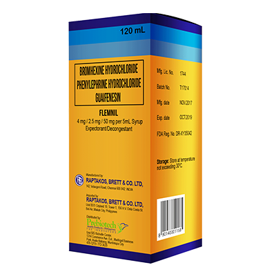 As with other symphathomimetic drugs Bromhexine Hydrochloride + Phenylephrine Hydrochloride + Guaifenesin (Flemnil, should be used with caution in the presence of hypertension, hyperthyroidism, diabetes, heart disease, peripheral vascular disease, glaucoma and prostatic hypertrophy. Patients with a history of gastric ulceration should be carefully observed during treatment with Bromhexine Hydrochloride + Phenylephrine Hydrochloride + Guaifenesin (Flemnil. Do not use the drug after the expired dated mentioned on the label.